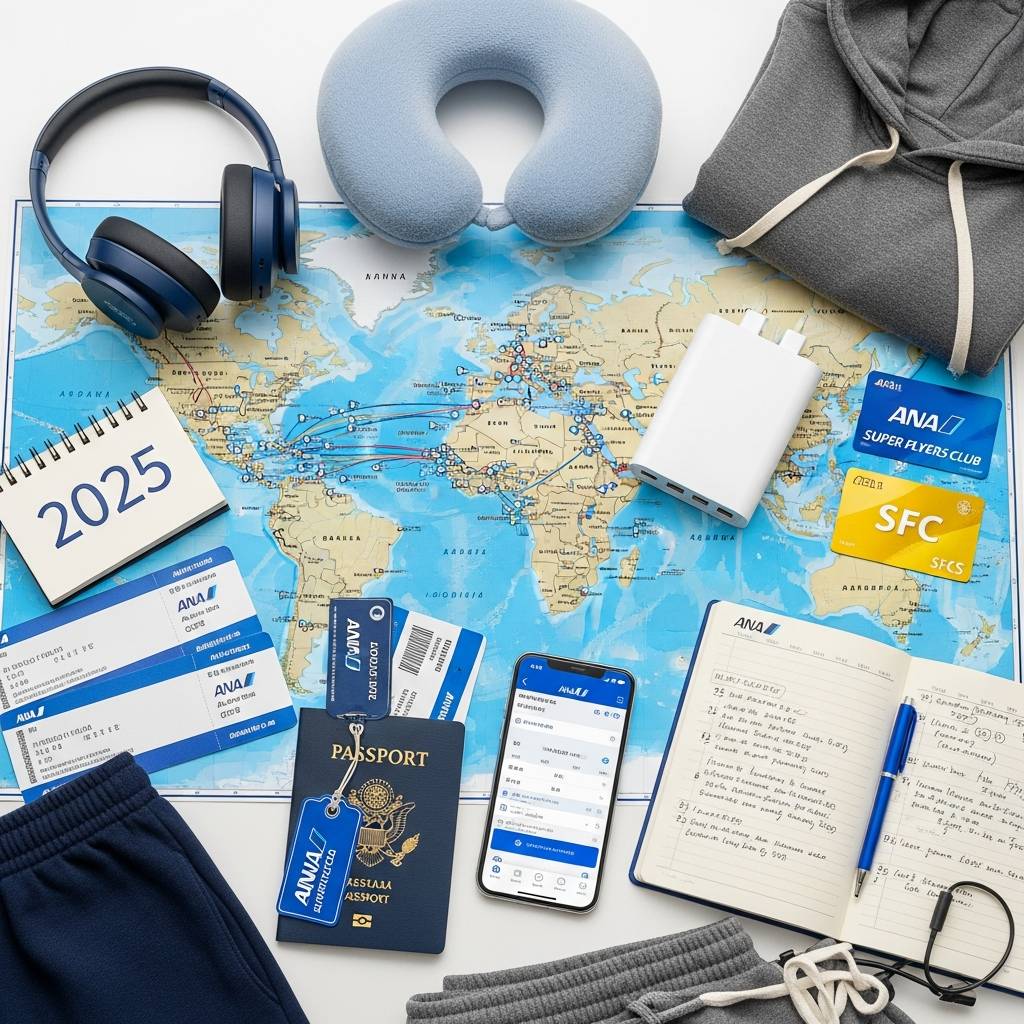 SFC修行を効率的に行うためには、いくつかの必携アイテムがあります。まず必須なのがANAカード。プラチナ、ゴールド、ソラチカなど様々な種類がありますが、特にANAアメリカン・エキスプレス・プレミアムカードは空港ラウンジの利用や手荷物の優先取り扱いなどの特典があり、修行中に重宝します。